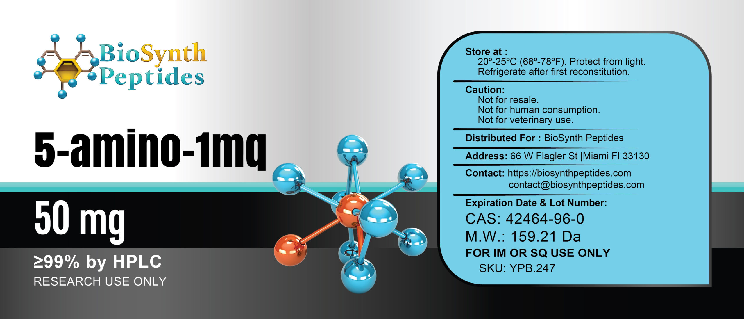 • Metabolic Health and Energy Production: This peptide is used to study its effects on fat metabolism, insulin sensitivity, and mitochondrial efficiency. 5-Amino-1MQ (50mg) provides valuable insights into improving metabolic health and energy production at the cellular level.