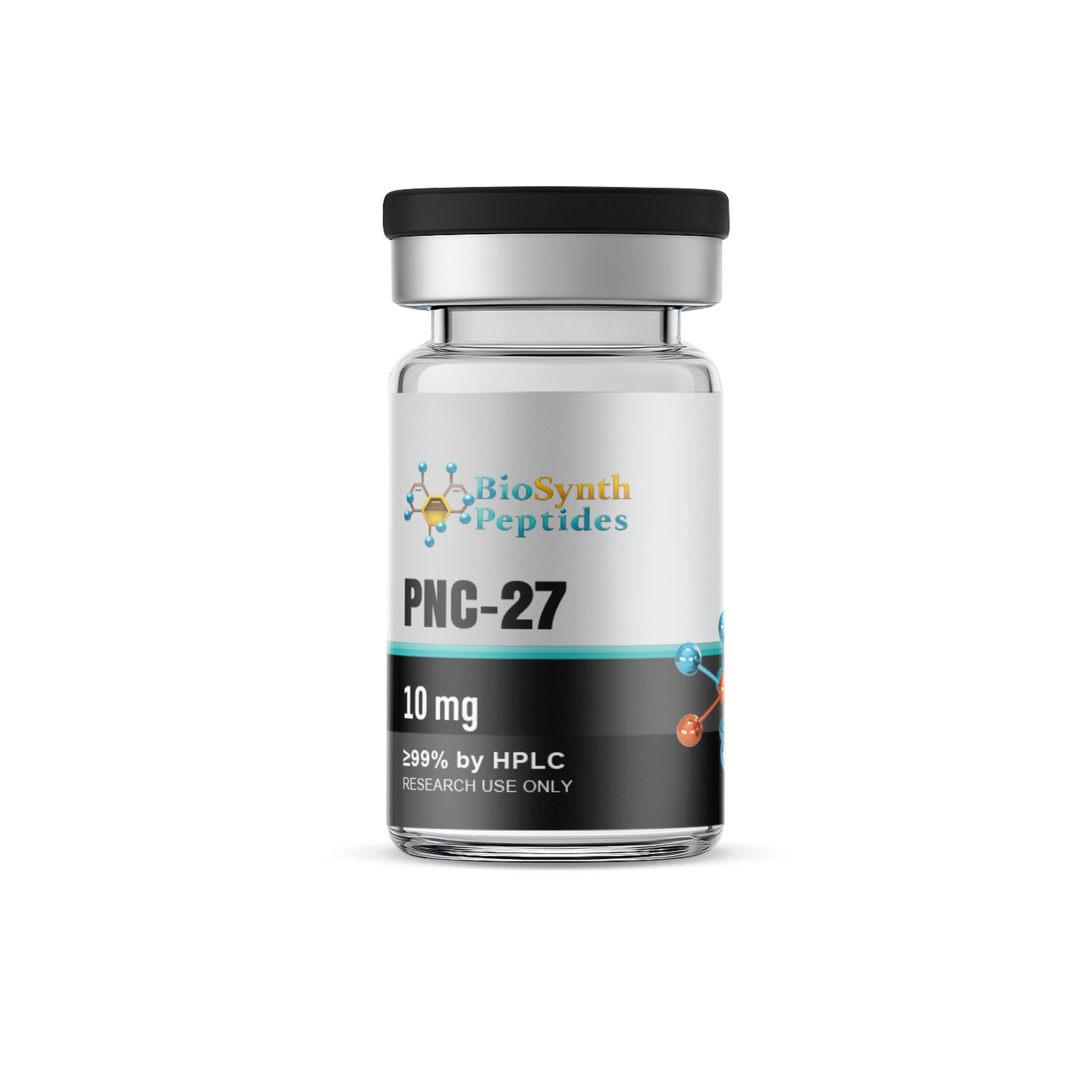 • PNC-27 (10mg) is a synthetic peptide studied for its potential to induce apoptosis in cancer cells and suppress tumor growth, particularly in solid tumors.