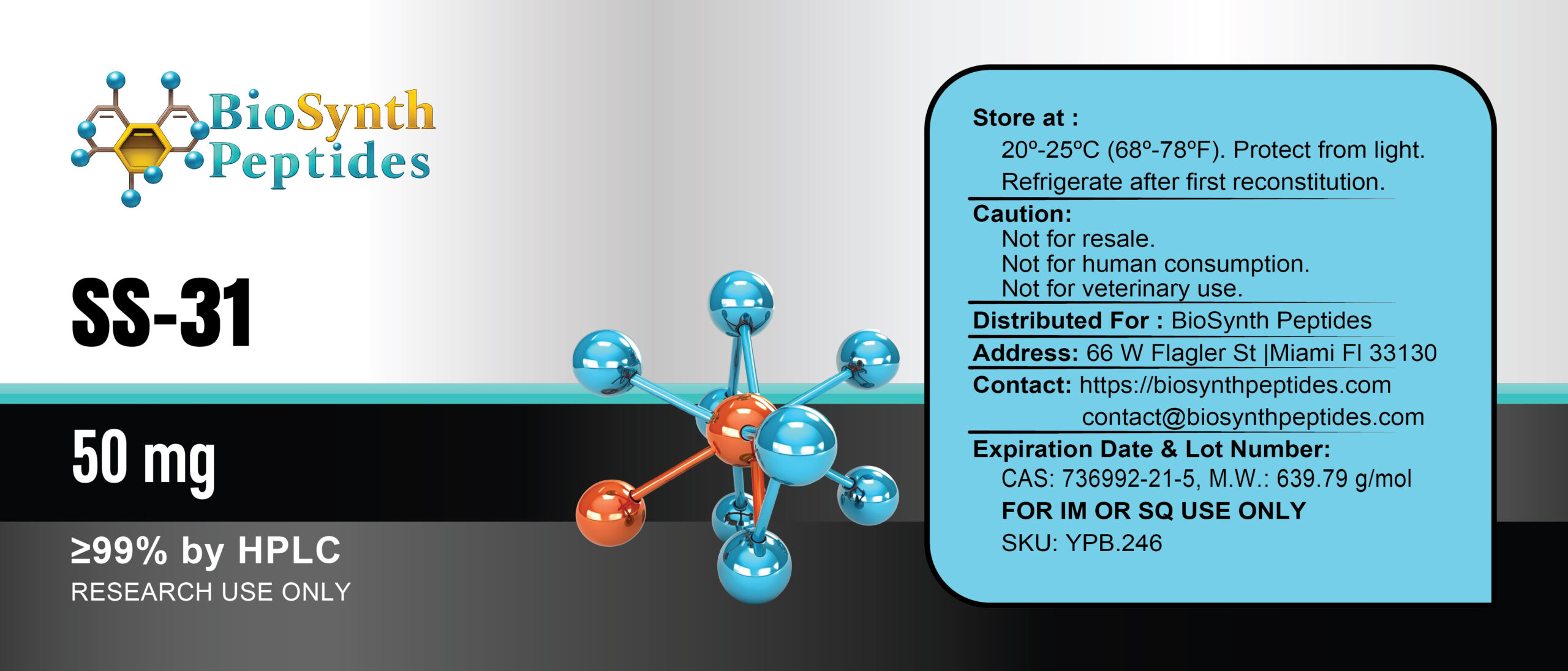 - SS-31 (50mg) is a mitochondrial-targeted peptide that effectively binds to the inner mitochondrial membrane, where it improves mitochondrial function, reduces reactive oxygen species (ROS), and enhances cellular energy production. This peptide is integral to studies in cardioprotection, mitochondrial dysfunction, and aging.